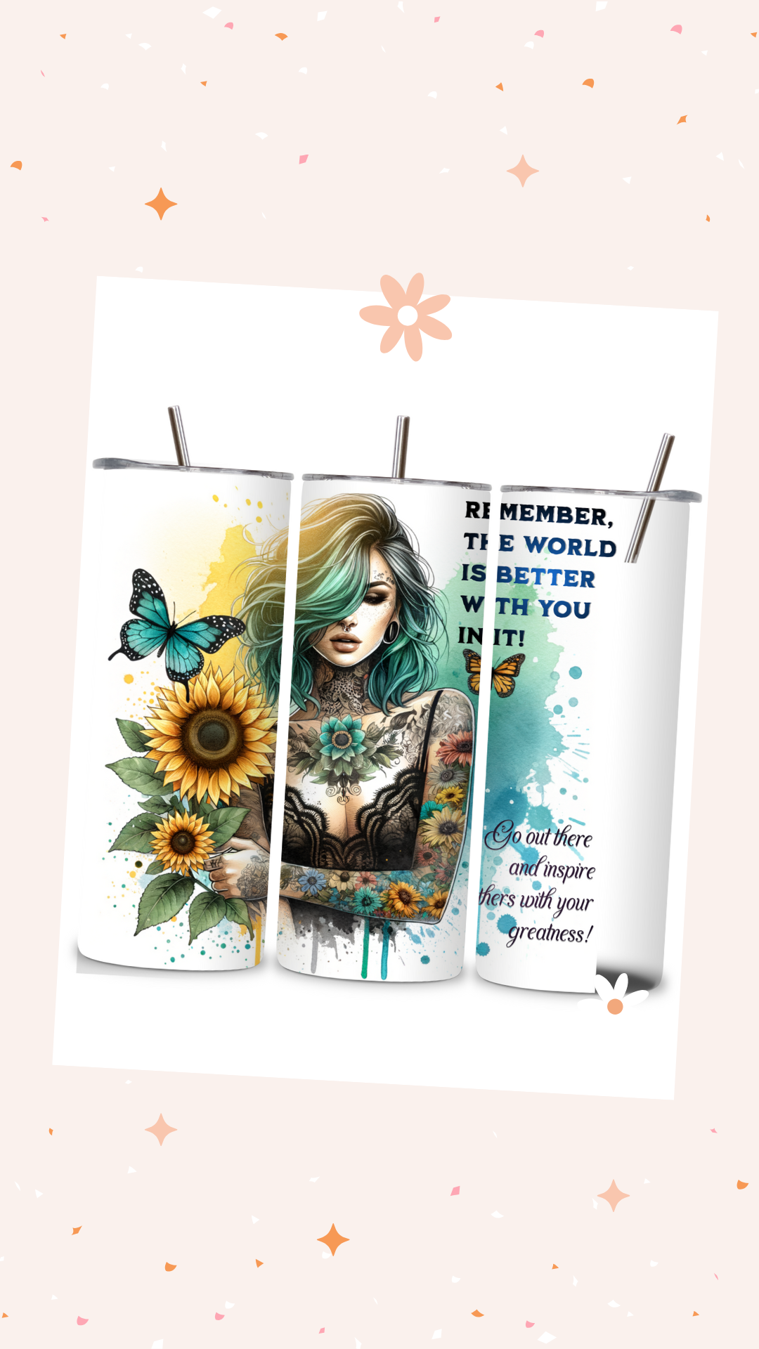 Package includes: tumbler, plastic lid, metal straw, and straw cleaner.