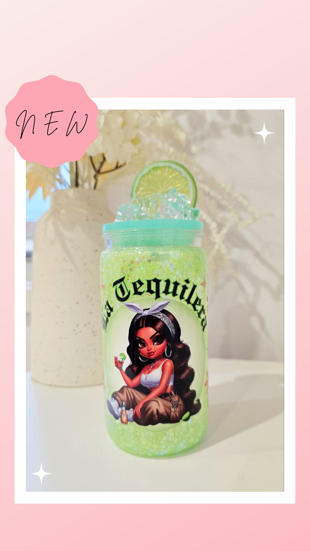 Comes with a decorated green lid, straw